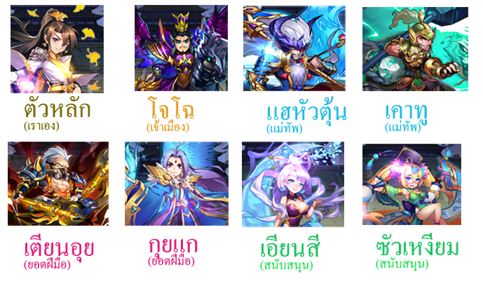 จากที่ผมได้ลองมาซักพักนึงนะครับจะเห็นได้ว่าในแต่ละก๊กจะมีขุนพลคล้ายๆ กันคือประกอบไปด้วย